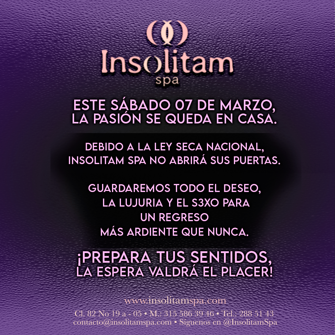 Este sábado 07 de marzo, la pasión se queda en casa. Debido a la ley seca nacional, Insolitam Spa no abrirá sus puertas.
